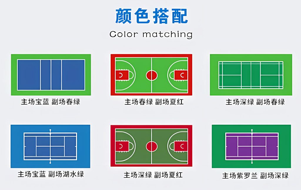 二、球场工程:户外各类球场可选择硅PU、丙烯酸、EPDM、悬浮地垫材质,颜色多样且可调。